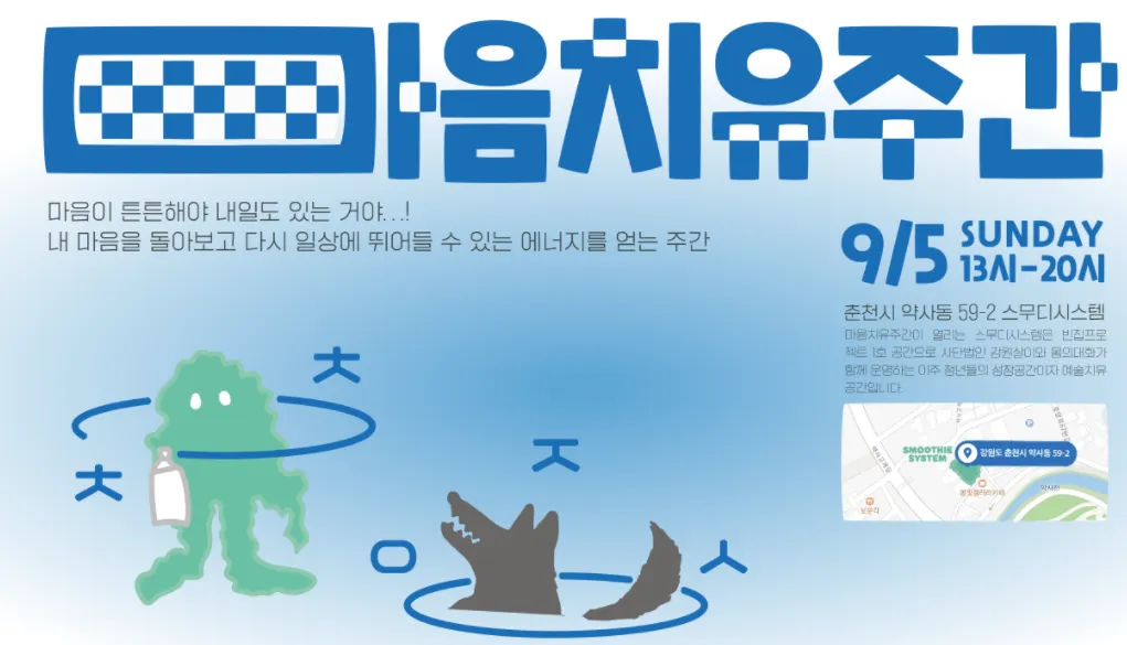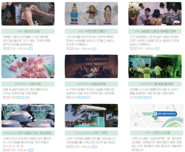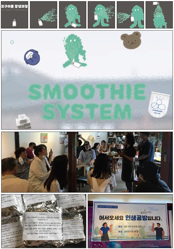 인생공방 1호점(시범사업) 스무디 시스템은 약사동에 위치한 생활문화공간이자 일상에서 잠시 멈춰 나를 돌아볼 수 있는 치유의 대화공간이며 청년들의 성장공간입니다.